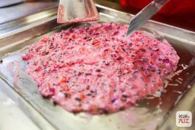 据说是芜湖最早炒酸奶的,去时老板正好在炒,应该是草莓味的酸奶,看着就有食欲。粉红色的酸奶,冰脆爽滑,入口留下味道回味无穷,入口之后又软化成冰激凌,最后变成了奶昔,太棒。