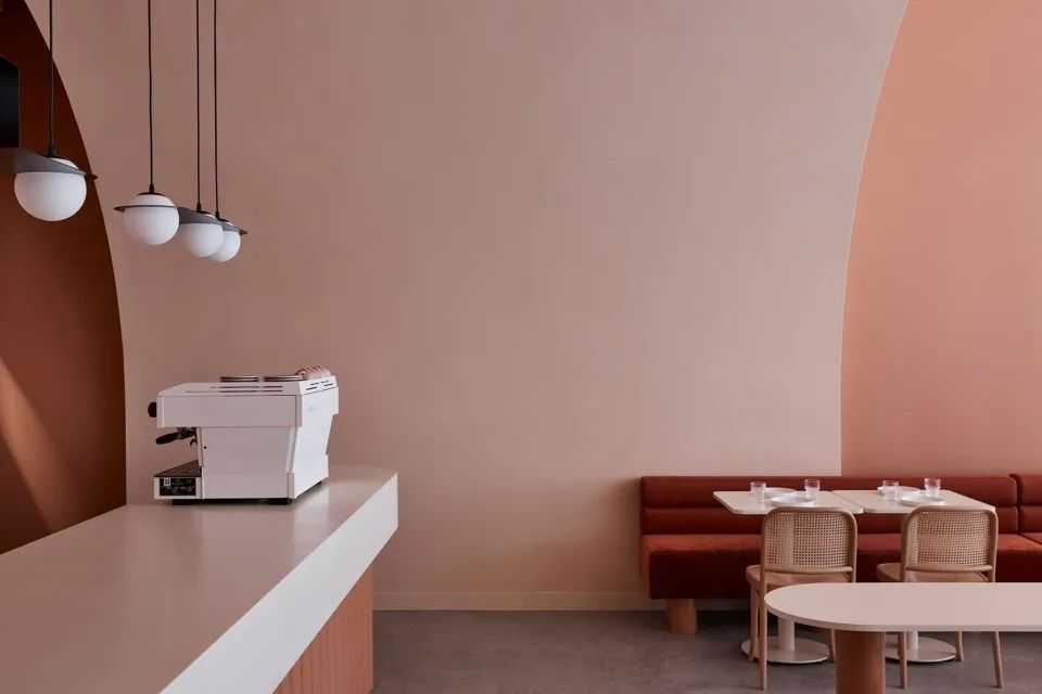 内部空间、顶面和墙面以有肌理感的粉色为主,地面由白色水泥向室内延伸,包括吧台,靠墙座椅,背景墙等均为白色水泥纵向延伸,与粉色墙面穿插融合形成构图。梁与柱保留原有的水泥质感不做多余处理。