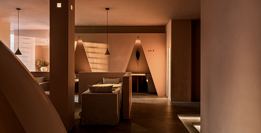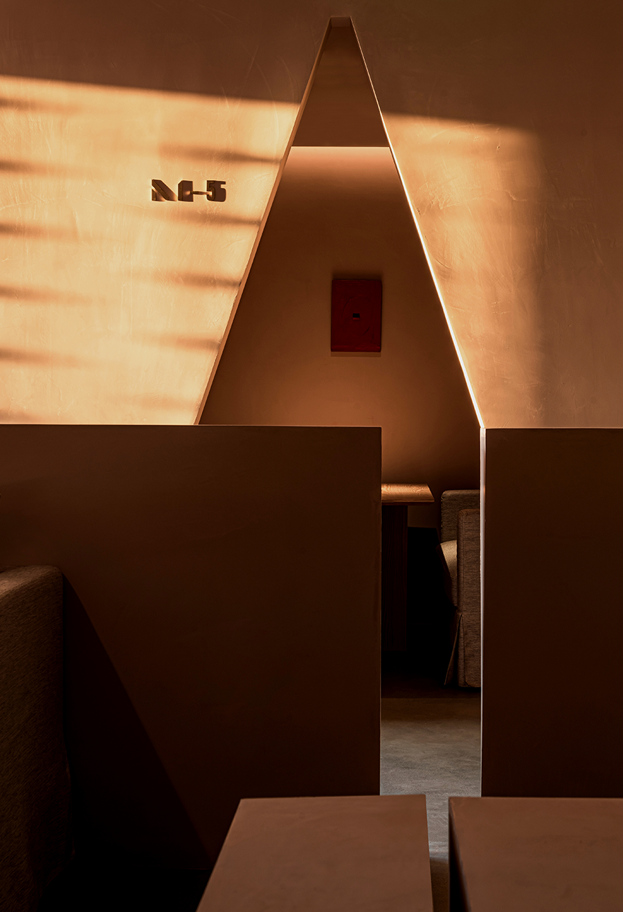 设计师用三角“刺破”天花,所以边界此后去哪,圆被从中割裂,深不见底的红色在蔓延,竟然从眼里渗透到情绪里,这又是什么在作用。