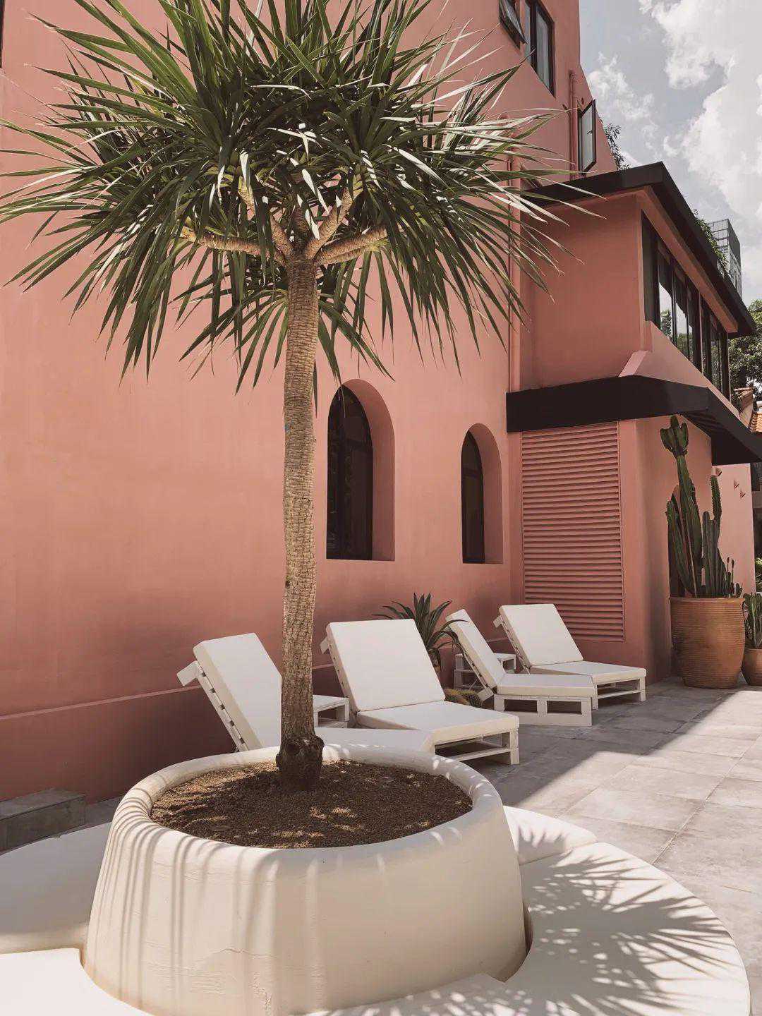 该设计希望带给客户室内室外戛然不同的两种感受,但从风格调性上却贯穿始终,楼体外墙选用带记忆点的灰粉红,使得房子远看就有强烈辨识度,将原本外观的窗户及某些细节进行了改造调整,使其修饰的更干净简约和贴近主题,但又保留了原本局部上下错体的有趣结构,金属支焊制而成的拱形门,随意堆砌的各种热带植物,使入口就具有迎面而来的仪式感和异域风情,往里走是户外花园,在原本空旷的平地上,设计师巧妙的设置了一个弧形水池和中庭座位区,将动线分割的更灵动和具有层次感,随意刷上米白漆的可折叠木质户外躺椅,略带粗糙的手工质感,散落在热带植物间的随意摆放,墙上斑驳的阳光,一切看似貌不经心却充满热带岛屿般的休闲风情。