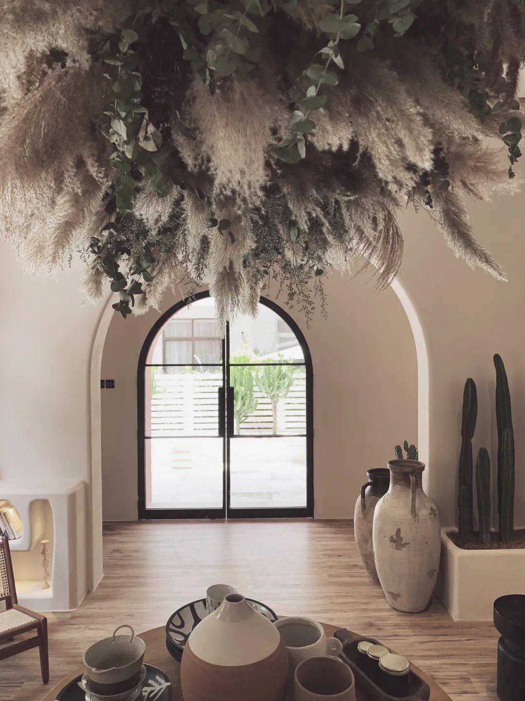 一楼室内空间特别改造了前后两道户型玻璃门,让客人在花园和室内穿梭走动时更多增一些特别的体验,室内分成主厅,次厅及后厨三大块,每个空间均巧妙的用弧形门关做分割,室内墙体选用灰白色粗糙肌理感漆,洞穴结构让所有饰品的呈现显得精致独特,主次厅的天花运用旧船木作横梁点缀,打破原本空间沉闷平淡感,点睛之笔是悬吊在天花上的巨大花艺装置,与下面的复古钢琴和中古旧物形成很好的视觉呼应,座位区除了设计师精心选用的经典藤编瑞克椅,靠墙部分还将户外座位设计特点直接引用到室内,具有趣味性又与户外形成一定的特色关联,整体空间在淡淡的植物草本味道陪衬下体现出浓浓的异域寂静风。