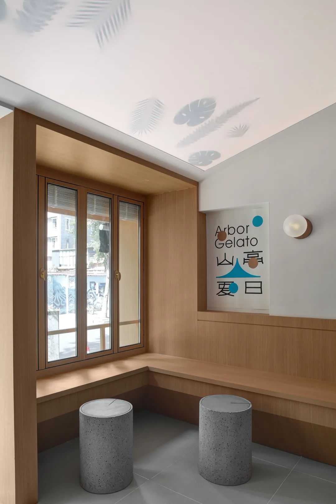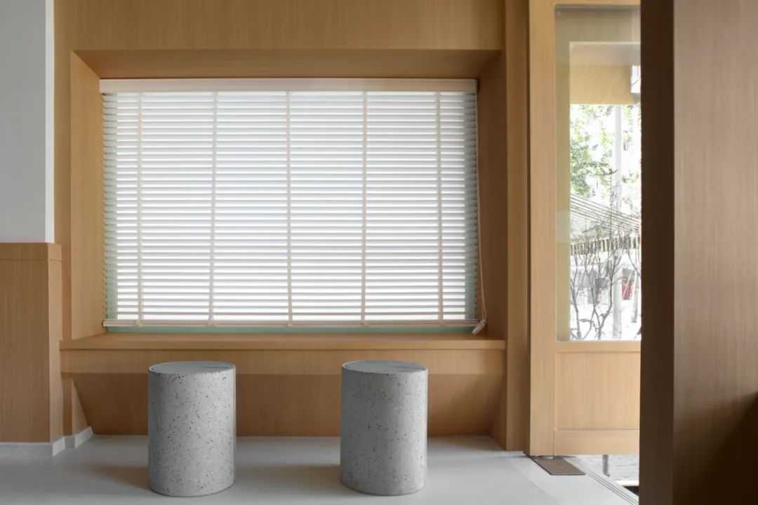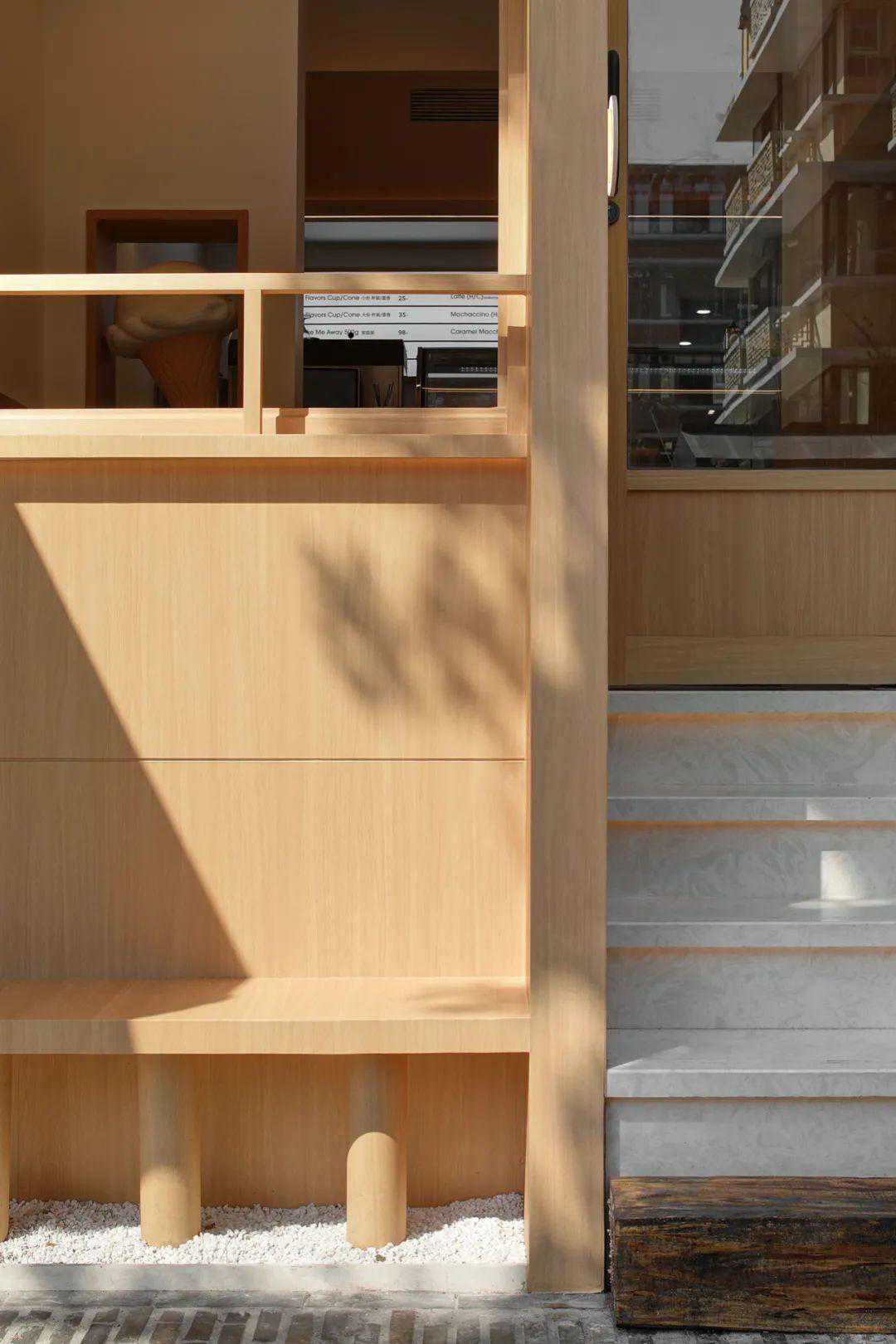 设计从色彩进入,用体块构造表达,辅以灯光氛围,最终落地。入口是一面“L”形的粉色墙体,右下角隐约能看到内部露出的白色结构体,白色的门套结构甚至已经突破粉色的包裹,使进入内部空间这个行为更“理所当然”。远处还能透过左边墙面的窗口看到内部咖啡师的制作,顾客未进门就能感受到氛围。门面亮点是一根横跨整个粉墙的霓虹灯管,傍晚以后有很强的视觉冲击。门前还有一个小院子,白水泥从地面长出来,形成台阶、矮墙、花坛、平台。