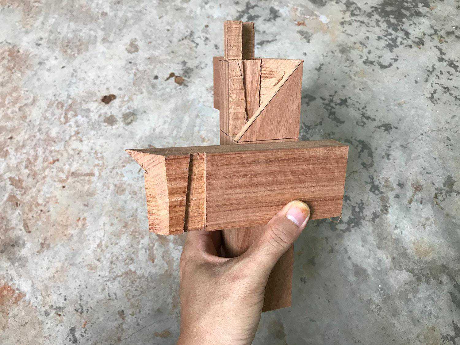 粽角榫因其外形仿佛粽子角而得名。三根料相交的一个结构,任何一个角度都看不到料横截面。