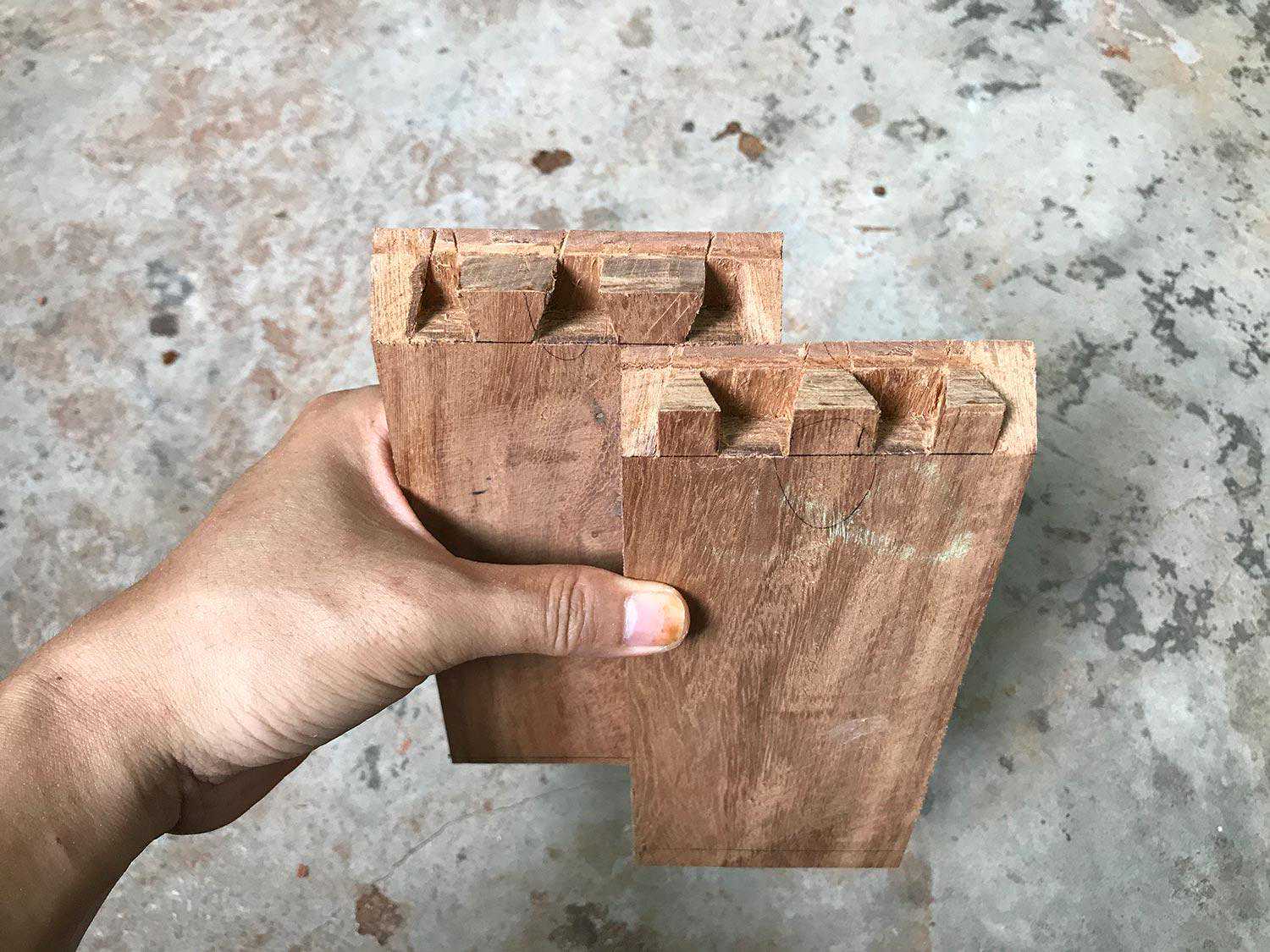 这种方法是平板角接合的最讲究方法,从外表看不到榫头,但不如明燕尾榫牢固。