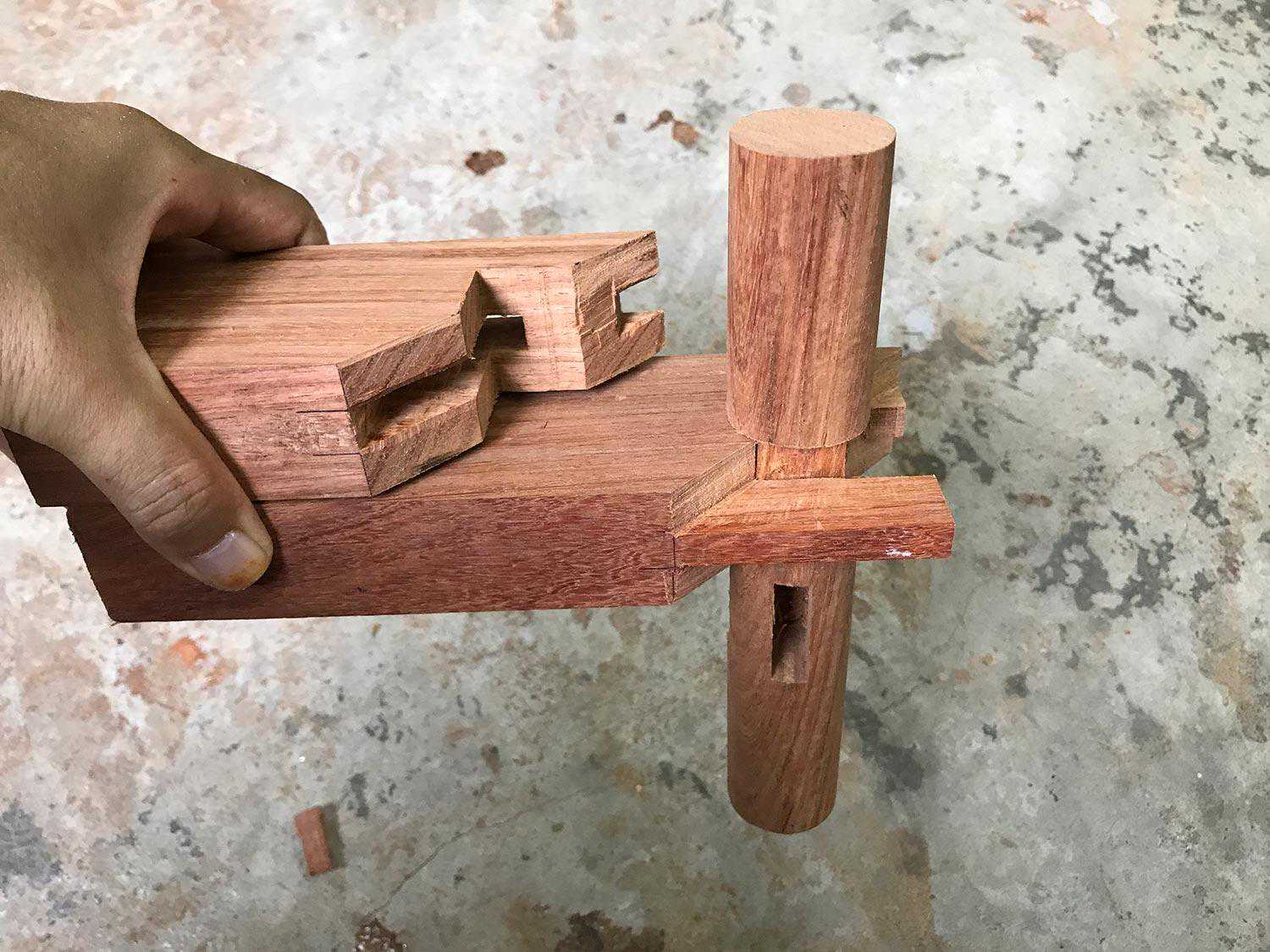 榫头的肩是弧形的,肩的弧度大小和相交圆材的接触面弧度一致。