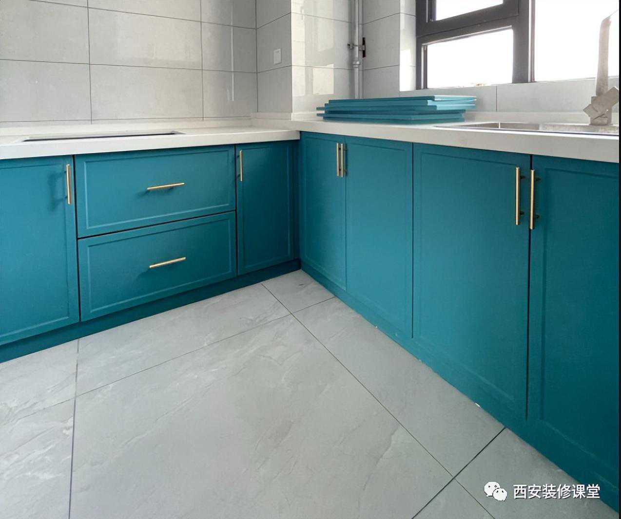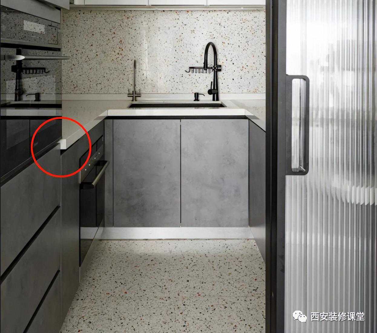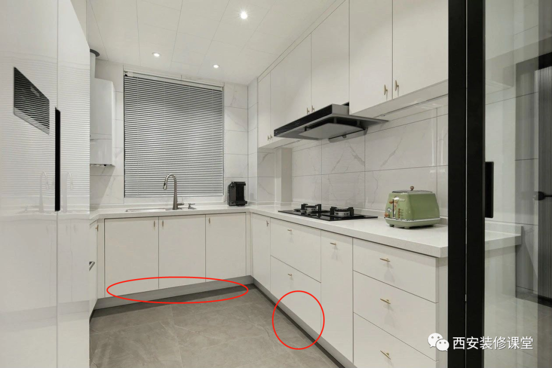 ▲没有人规定踢脚板非得用默认的PVC材质,你也可以使用和柜门一样材质的做踢脚板,颜色更统一;但是实际上和你家柜门材质有关。厨房时间久了避免不了要拖地,此时如果是PVC的话能更耐用,但是用柜门材质肯定没有PVC耐用以及好更换维修