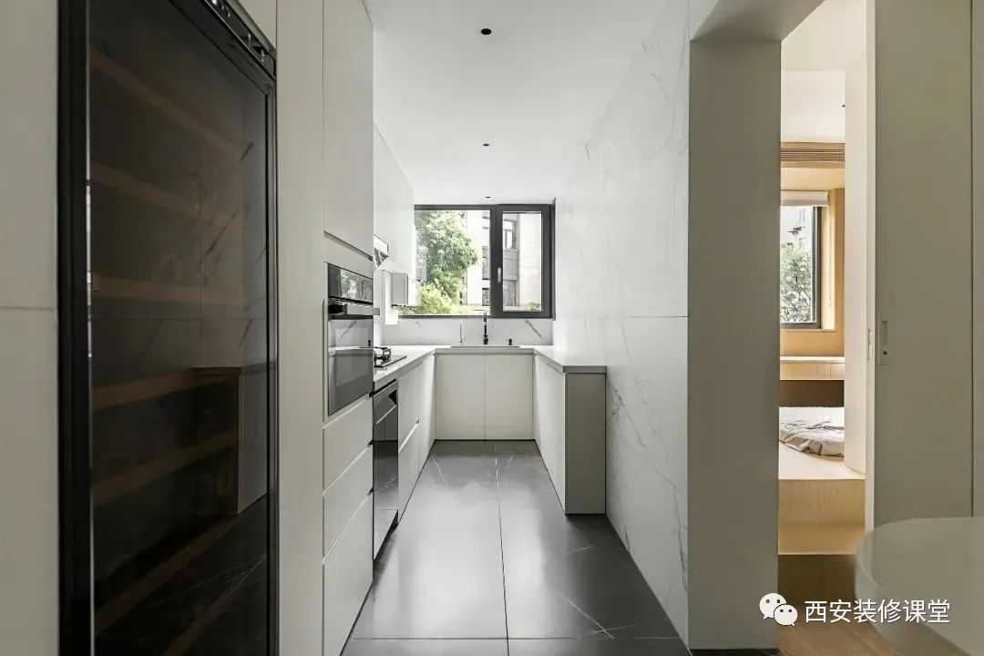 如图的格局,为了使空间显得更宽敞,同时满足U型窄边柜的需求,就可以把左侧灶具的柜体缩小5公分,别人台面是60公分,你可以做到55公分,同时台面与柜门平齐做法,节省5公分空间并不影响灶具这里的空间,但是满足了窄柜的布局,过道只要能保证90cm左右即可。