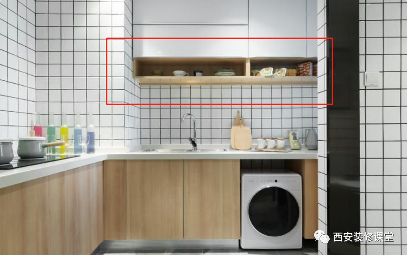 ▲如果是厨房空间,因为无法做成薄厚不一的吊柜,无法改变形式,此时可以如上图的做法,封闭和镂空结合的形式,来弱化因为层高过高吊柜太压抑的问题