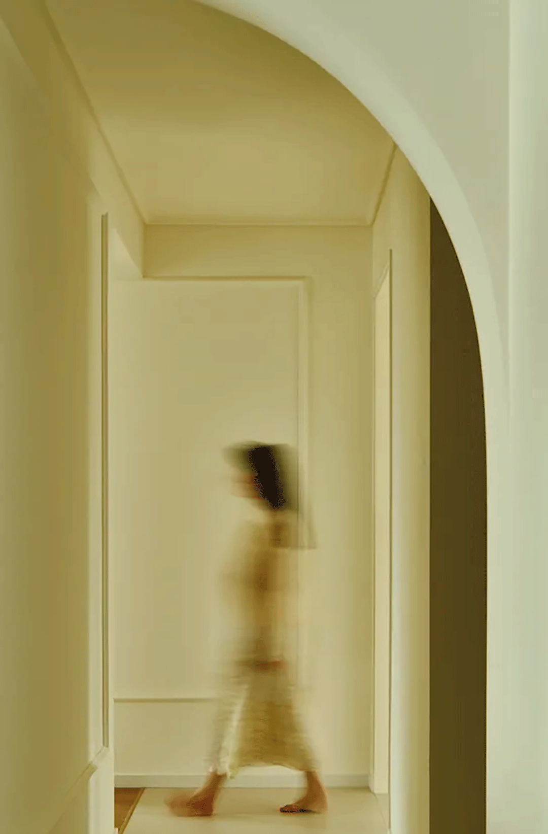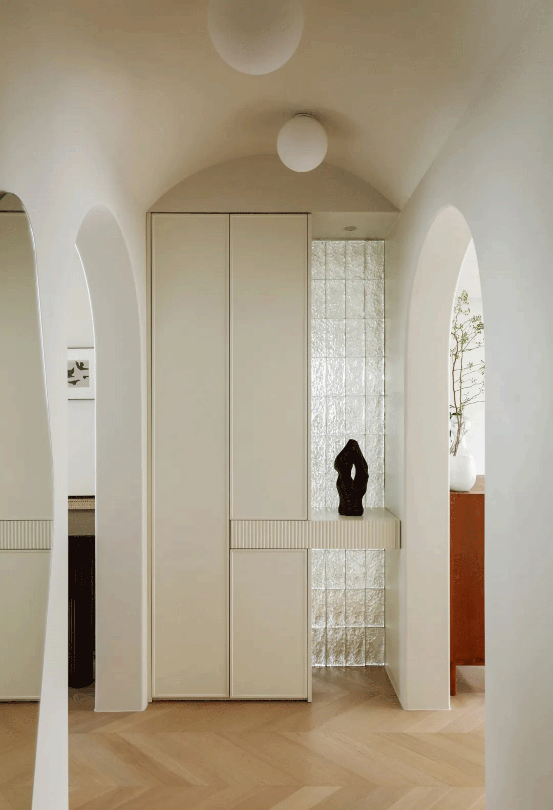 这是位于北京的一套住宅设计作品。入室玄关处左右各有一个法式拱门,玻璃砖装饰使空间更加通透,去除沉闷感。玄关设计通体的隐形收纳柜和抽屉,达到“空无一物”的美感。