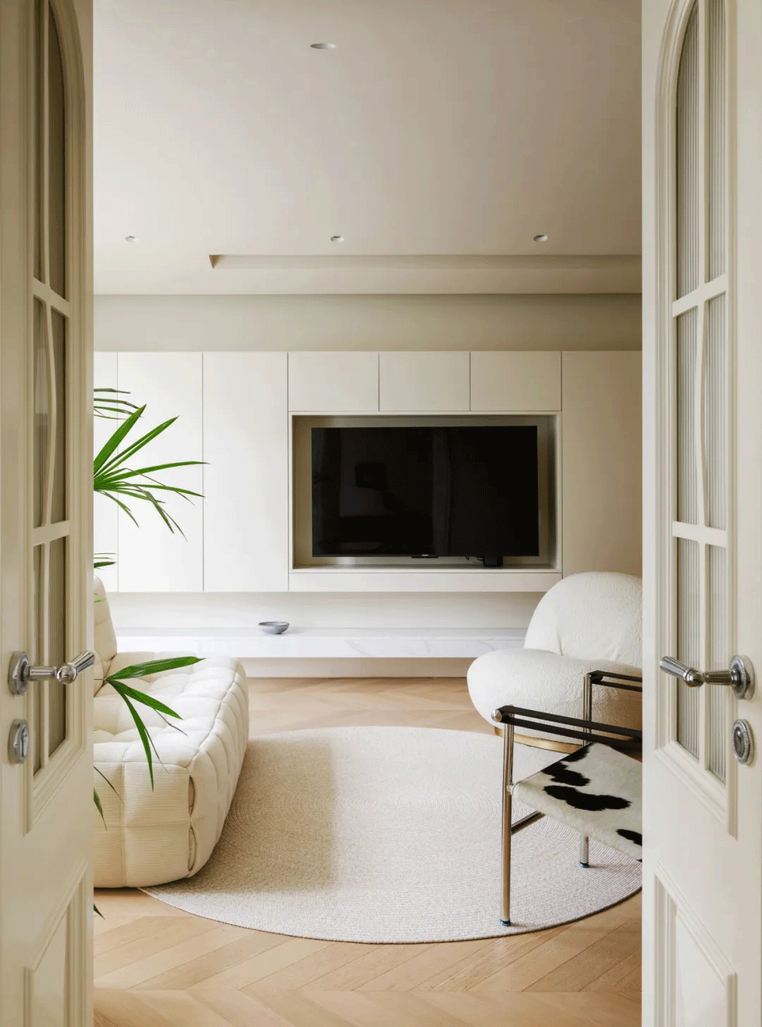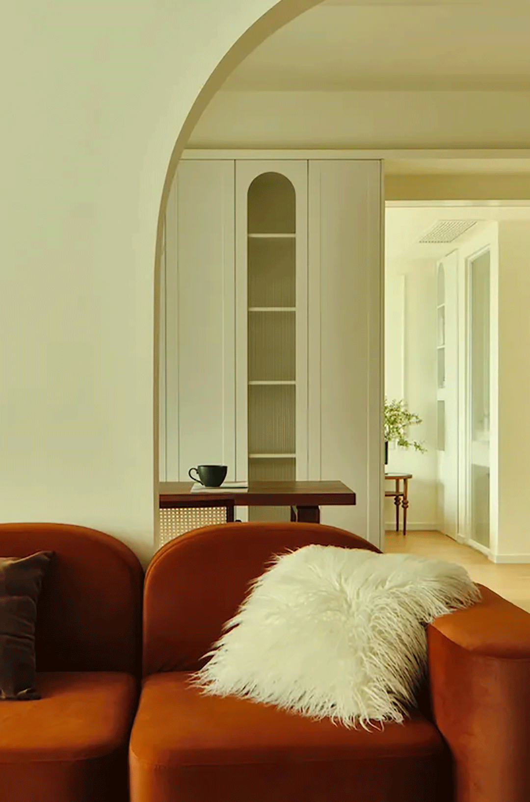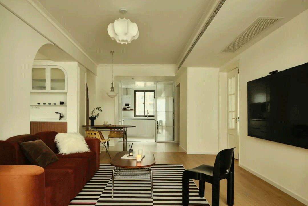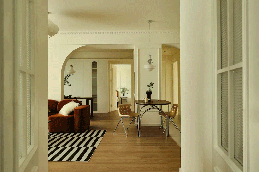 客厅做了对称双拱门设计,充分营造对法式美感生活的想象。对称设计强化了空间的秩序美感,也延长了视觉景深。