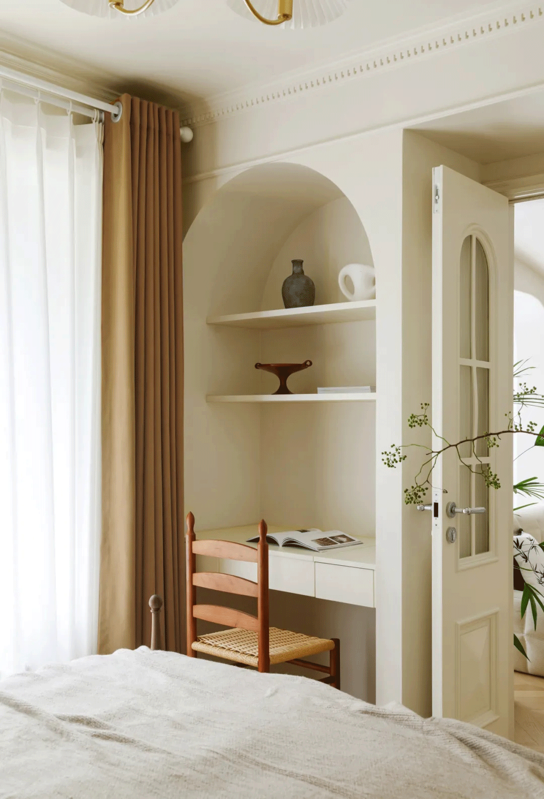 客厅一侧设置法式双开门通往卧室,梅子色的床头、金色丝绒质感窗帘,搭配床头的金色小壁灯,点缀绿植,营造出了复古缱绻的质感和异域风情。