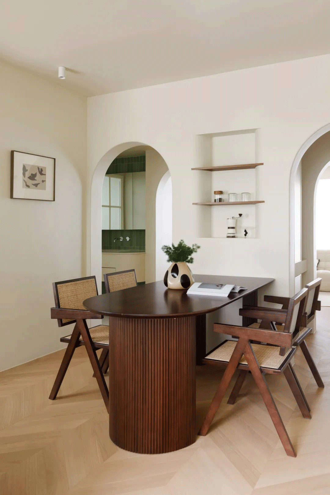 穿过双拱门即来到了餐厅,胡桃木餐桌椅点缀编织元素,使空间充满复古的情调。U型半开放厨房,奶油色搭配新芽色,充满小清新的复古感。