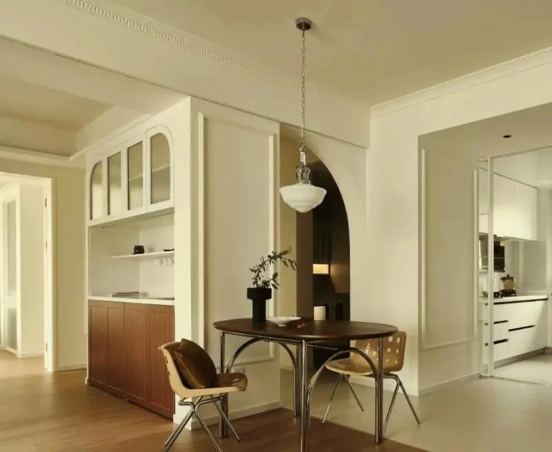 法式经典的弧形元素区分出主要功能区。石膏线、胡桃木桌子、金属桌椅腿,加上从几何门框中溢出的暖黄色灯光,共同营造出浓烈又克制的浪漫氛围。