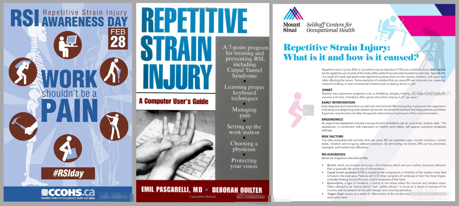 说起人体工学,就要知道重复性使力伤害,RSI(RepetitiveStrainInjury),它指的是各行各业中长期重复动作造成的累积性创伤疾病,包括不好的工作姿势,不合理的桌椅,设计不好的工具包括键盘鼠标等,引起肩膀、颈部、手臂的肌肉和神经损伤,导致疼痛或者技能受损,主要表现有: