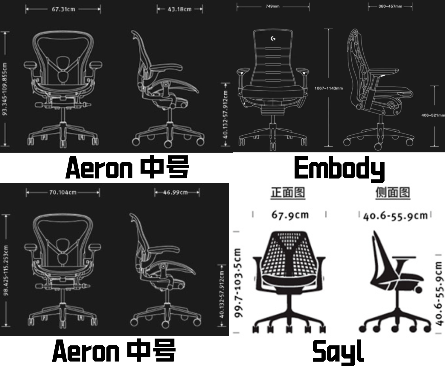 最核心的选购项是尺寸从我最熟悉的Aeron说起,Aeron他分大小号,并且官方专门提供了不同尺寸的适配人群。
