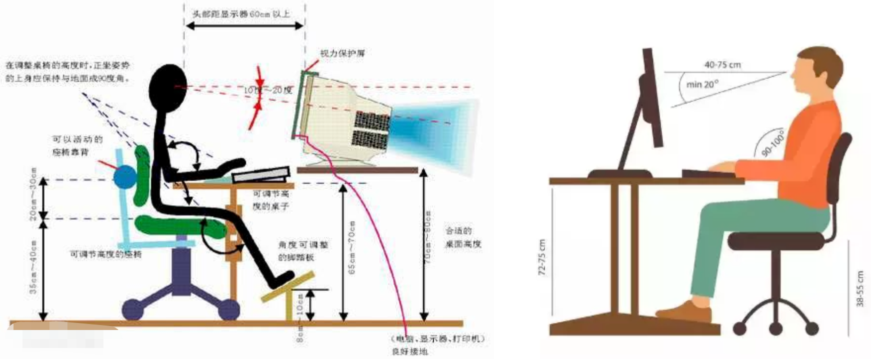 曾经键盘都放在书桌抽屉里,手必须放低去用键盘,会让整个身体向前倒,如今键盘都放在桌面上了,我们的椅子高度要让我们大臂与桌面垂直,小臂平行于桌面,这是调整桌子和椅子高度最合适的办法,挑好椅子高度后再调整显示器高度。
