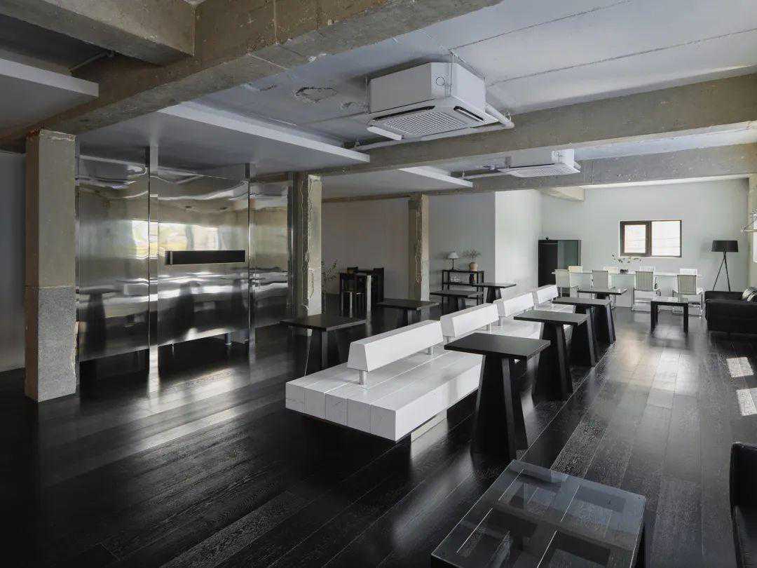 不锈钢(经过抛光处理)中央隔板用于分隔运动线,反射光线并投影在主墙上,以更生动地呈现所要传达的图像。此外,所有引人注目的家具都散发出一种整体的大众感,受到野兽派建筑的启发。